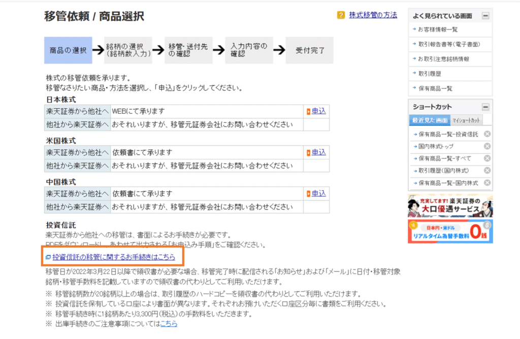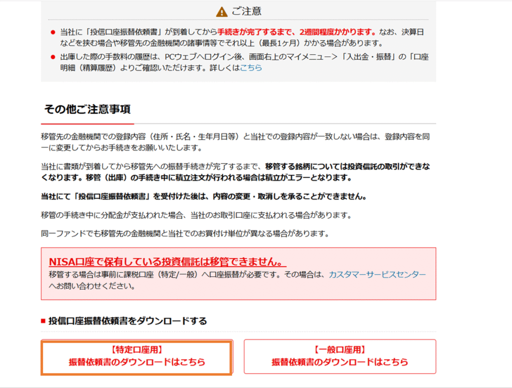 「移管・買取請求」のページ、投資信託項目から「投資信託の移管に関するお手続きはこちら」を選択