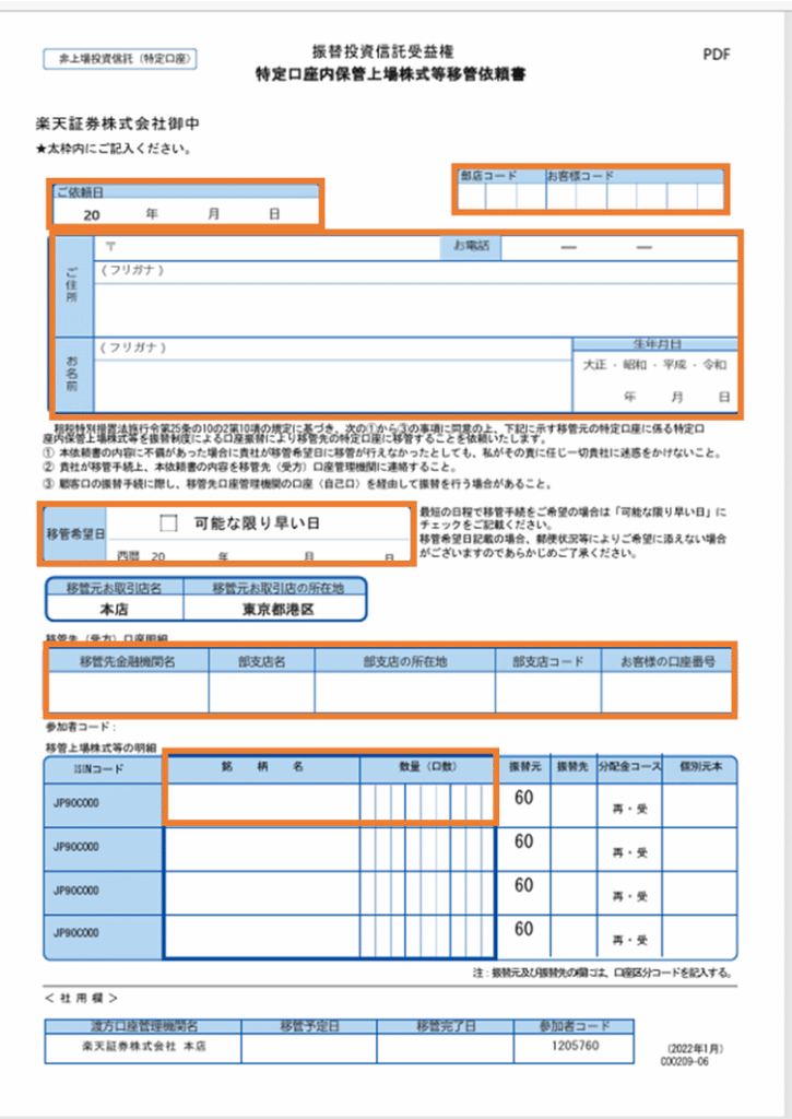 迷う点は、移管先金融機関(SBI証券)の「部支店名」と「部支店の所在地」かと思います。