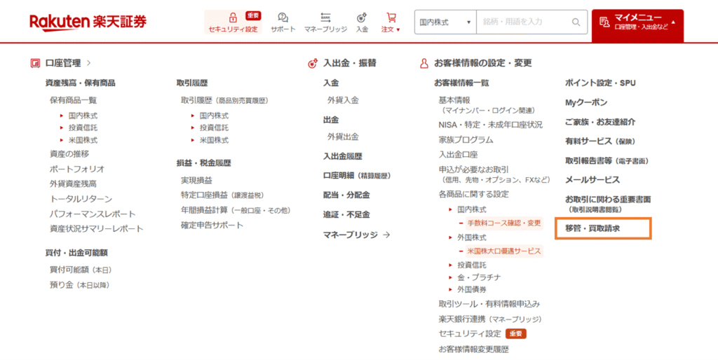 楽天証券ホームのマイメニューから「移管・買取請求」を選択